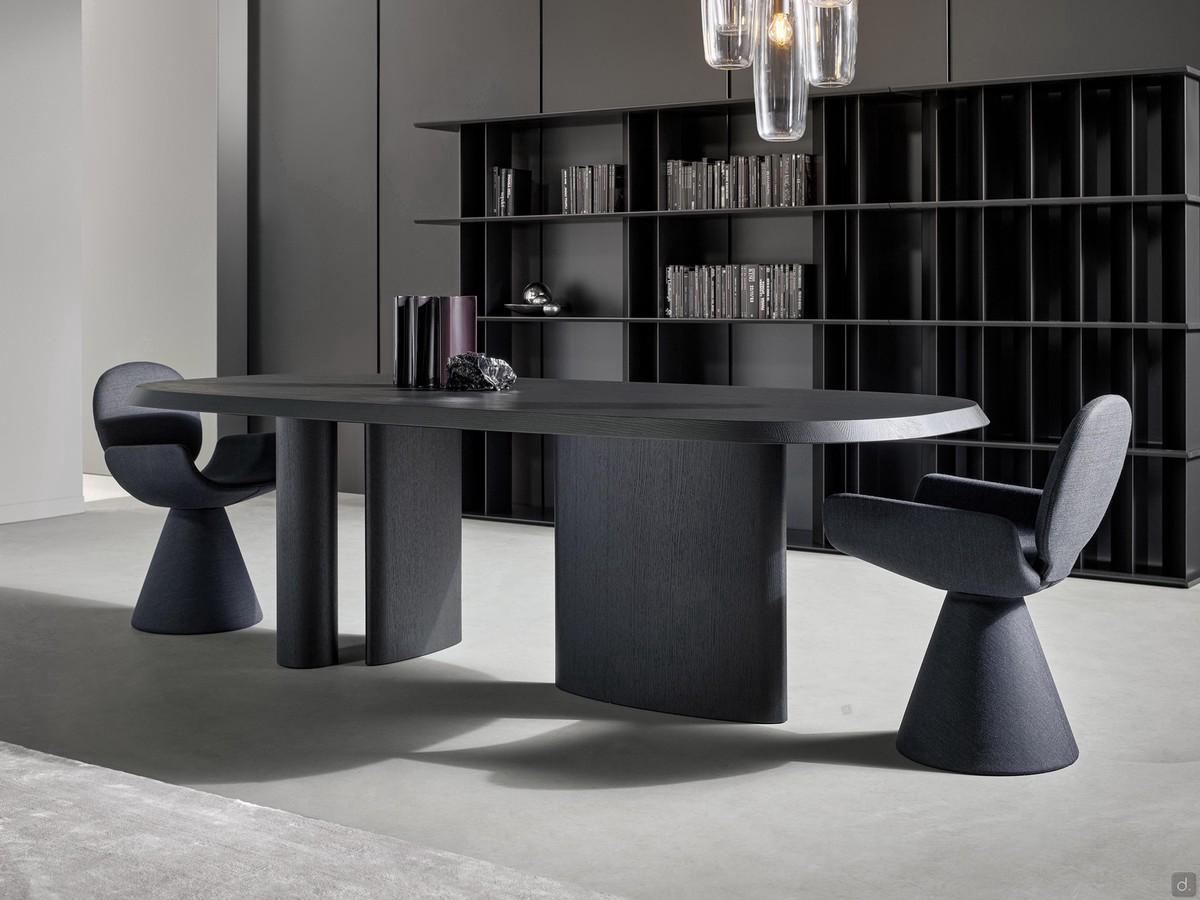 L'impatto del tavolo Padiglioni, risulta imponente ed al tempo stesso leggero nel suo insieme, grazie ai contrasti delle forme, cre creano un sofisticato equilibrio.