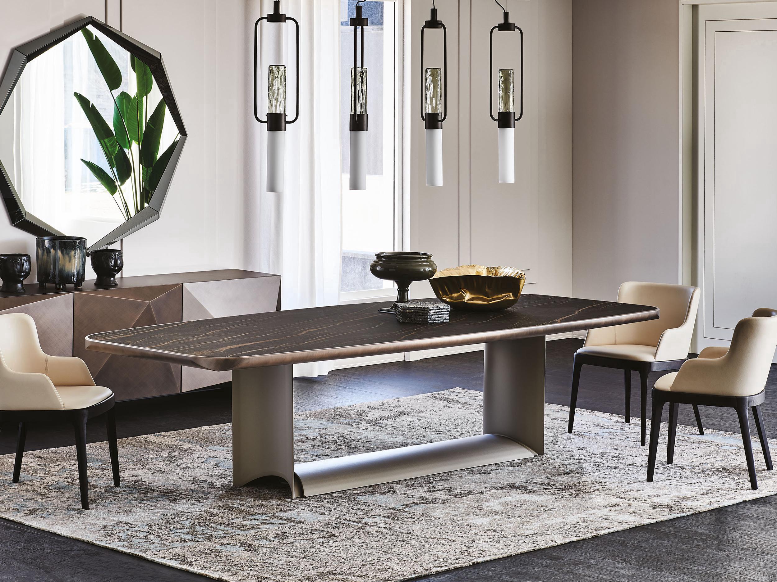 Piano in Keramik: lastra di porcellana laminata (spessore 0,6 cm) accoppiata ad una lastra di cristallo trasparente (spessore 1,2 cm) per uno spessore complessivo di 1,8 cm. Per le sole finiture Portoro opaco e lucido, la porcellana è spessa 0,5 cm (per uno spessore complessivo di 1,7 cm). Nei tavoli con bordo verniciato, il piano è in MDF con inserto superiore in porcellana dello spessore di 0,6 cm (0,5 cm per Portoro opaco e lucido).