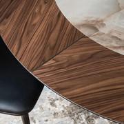 Soho di Cattelan è un tavolo in legno con inserto in ceramica posizionato al centro del piano rotondo, fisso o girevole.Soho è disponibile in numerose finiture pietra Keramik effetto marmo. Completa l'offerta una preziosa versione quadrata sagomata in pietra Keramik con profilo inferiore arrotondato in legno mdf laccato opaco con effetto spazzolato.Il basamento centrale minimal appare come una struttura a forma di ellisse traforato verticalmente, disponibile in metallo verniciato goffrato titanio, bronzo, nero o graphite. Questo particolare conferisce al tavolo Soho un effetto leggero ed elegante, perfetto per sale da pranzo connotate da uno stile ricercato.
