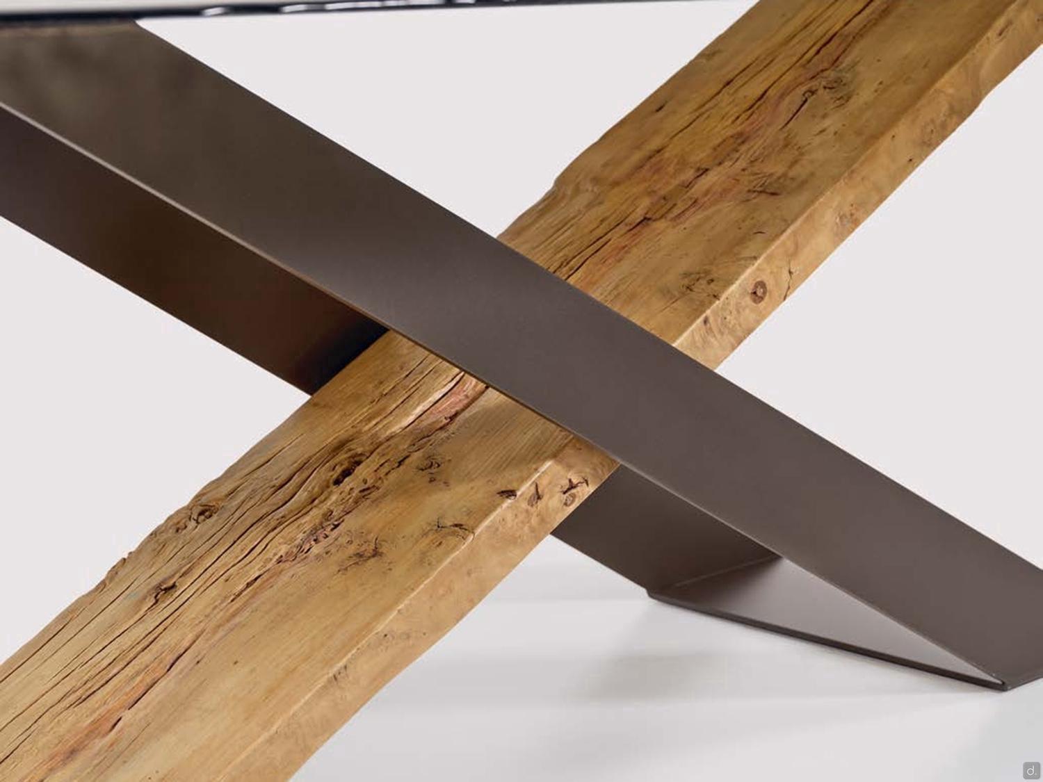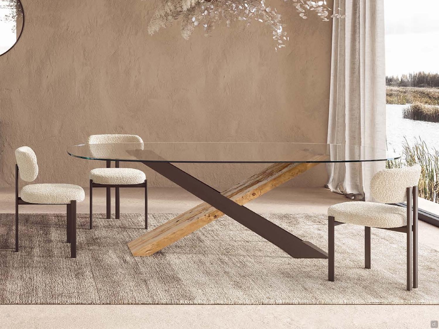 Il tavolo ovale con gambe a " X " Haynes è caratterizzato da un basamento costituito da due travi incrociate tra loro. Una è in metallo verniciato e l'altra in legno massello di frassino o in legno Secolare di recupero; l'abbinamento dei diversi materiali crea un contrasto materico dal forte impatto visivo. Il piano è in vetro trasparente extrachiaro, in tre diverse larghezze (160, 200 e 240 cm) e può ospitare da 6 a 12 commensali. Le due dimensioni più piccole hanno una base da 76 cm, mentre la più grande raggiunge i 143.Haynes è un tavolo molto versatile, ideale in una sala da pranzo o un salotto dallo stile rustico e contemporaneo ma anche elegante e sofisticato in base alla combinazione di finiture scelte.